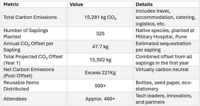 To counterbalance this impact, a large-scale tree plantation drive was conducted at the Military Hospital in Pune, where 325 native saplings were planted. Each sapling is expected to sequester 47.7 kg of CO₂ per year, resulting in an impressive offset of 15,264 kg in the first year alone. This left a net balance of positive 221Kg —an extraordinary accomplishment for such a large-scale gathering.